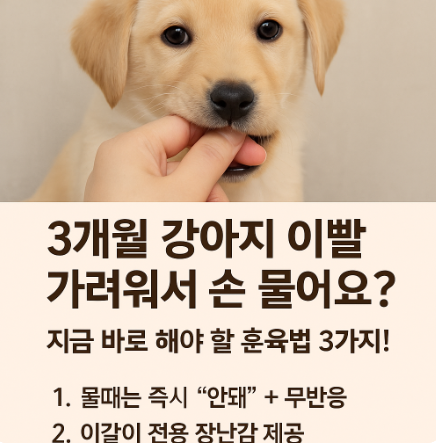 3개월 강아지는 이빨이 가려우니 물 대상을 제공해주는 것이 중요합니다. '치실 장난감', '고무 뼈', '천 재질 장난감' 등을 주면 보호자의 손을 무는 대신 자연스럽게 입 욕구를 해소할 수 있습니다.